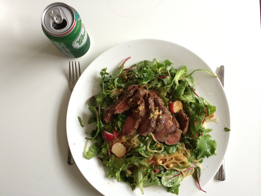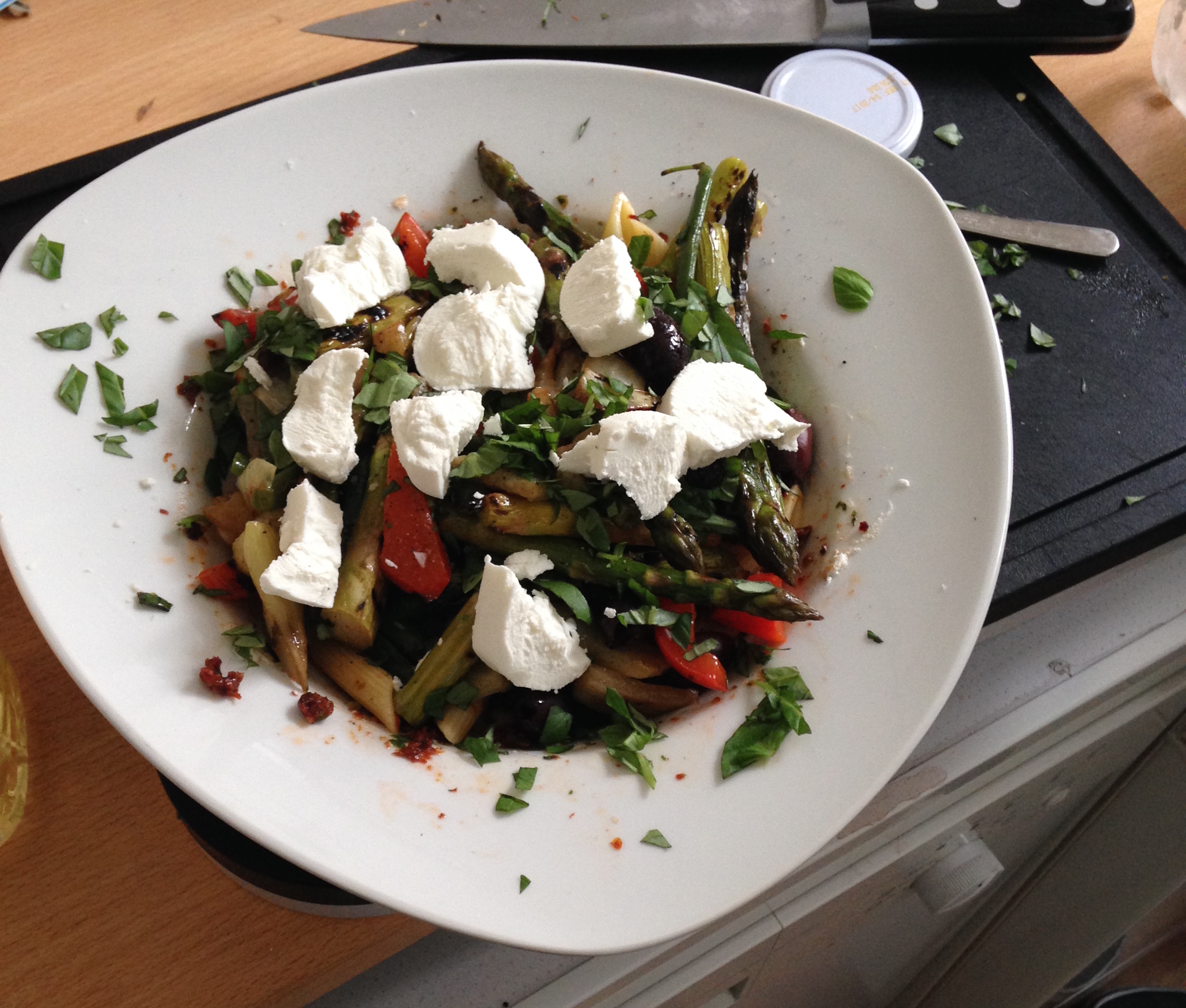 Blancheer de asperges en gril ze. Kook de pasta (in het water waar je net de asperges in blancheerde). Rasp ondertussen de citroen en meng het met een deel van de gesneden munt en olijf olie. Roer alles door elkaar. Pasta er bij. Parmezaan, peper en laatste beetje munt er over doen en dan genieten.