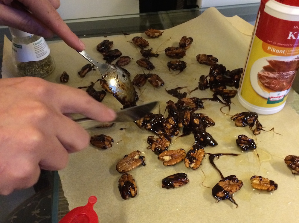 Vet een bakpapier vel in met wat olijf olie zodat de karamel niet blijf plakken. Doe de boter met bruine suiker in de pan en wacht tot de suiker vloeibaar wordt. Niet aanraken, dit is heel heet. Het koekt ook overal tegen aan dus alleen metaal gebruiken om de karamel te hanteren. Houd het goed in de gaten want karamel bakt snel aan. Bak ondertussen ook het spek en leg dat op een stukje keukenrol om het vet uit te laten druipen. Ze moeten mooi krokant worden. Gooi de Pecannoten erbij en roer ze in de karamel tot ze mooi rondom ingesmeerd zijn. Leg ze dan op het bakpapier om uit te harden.